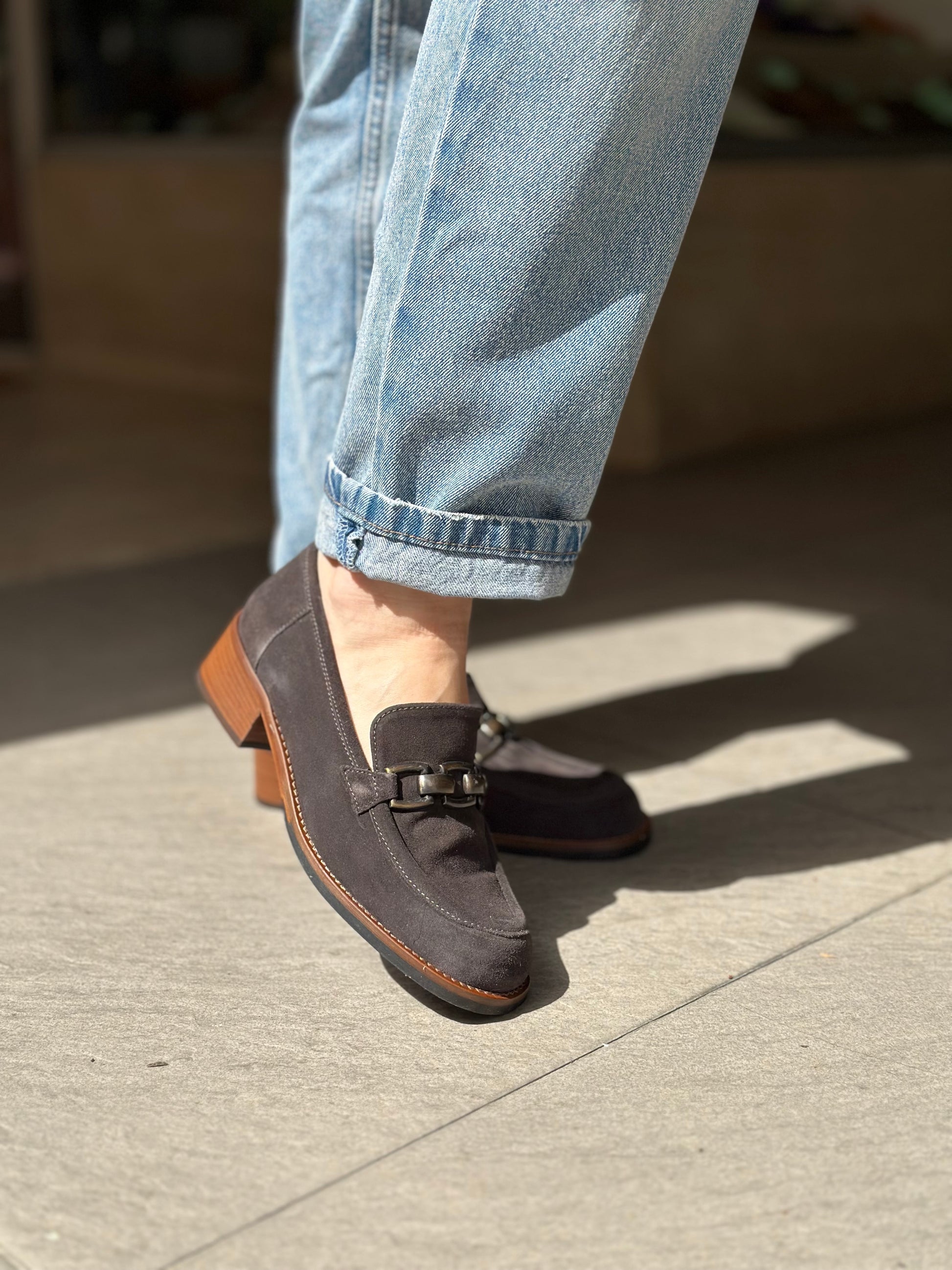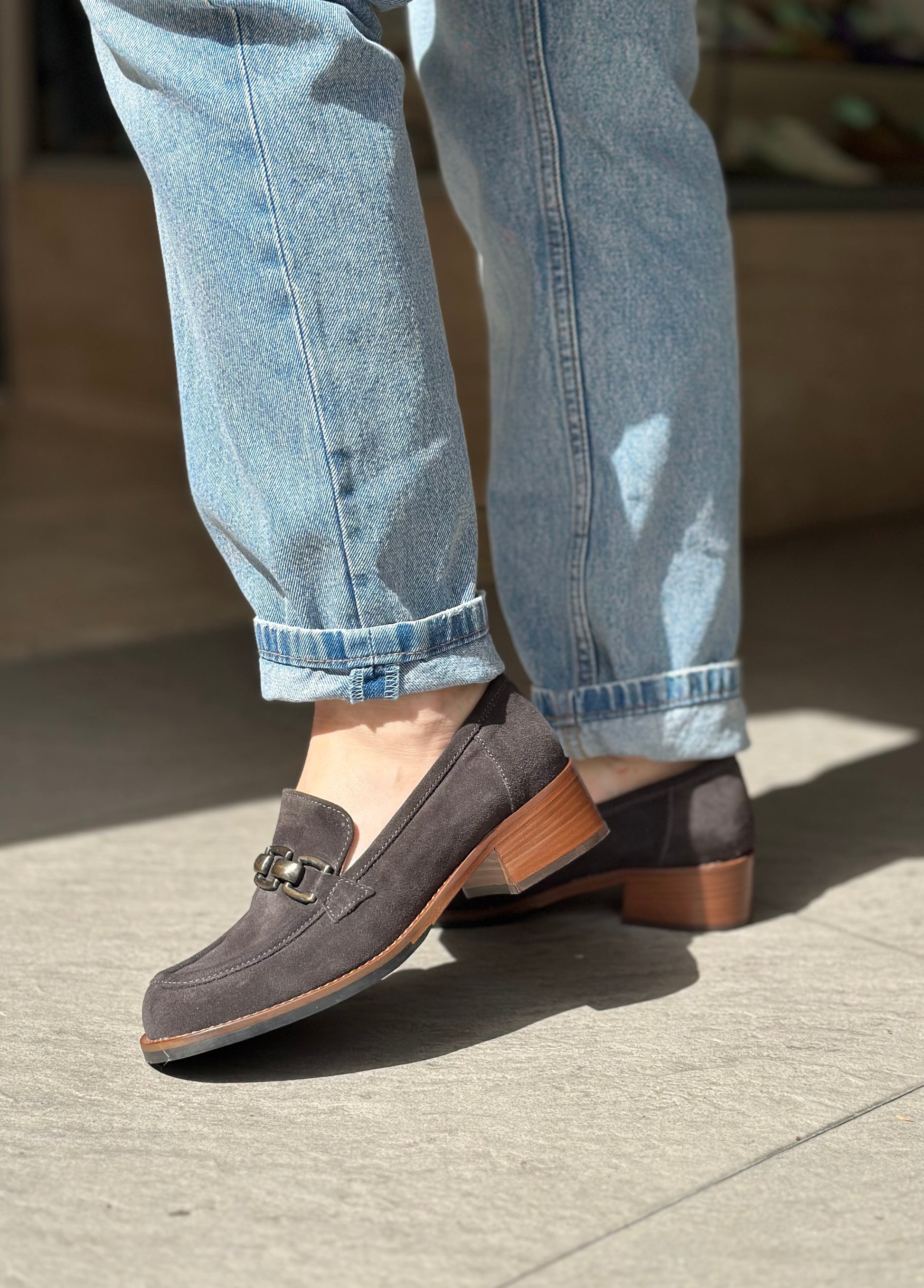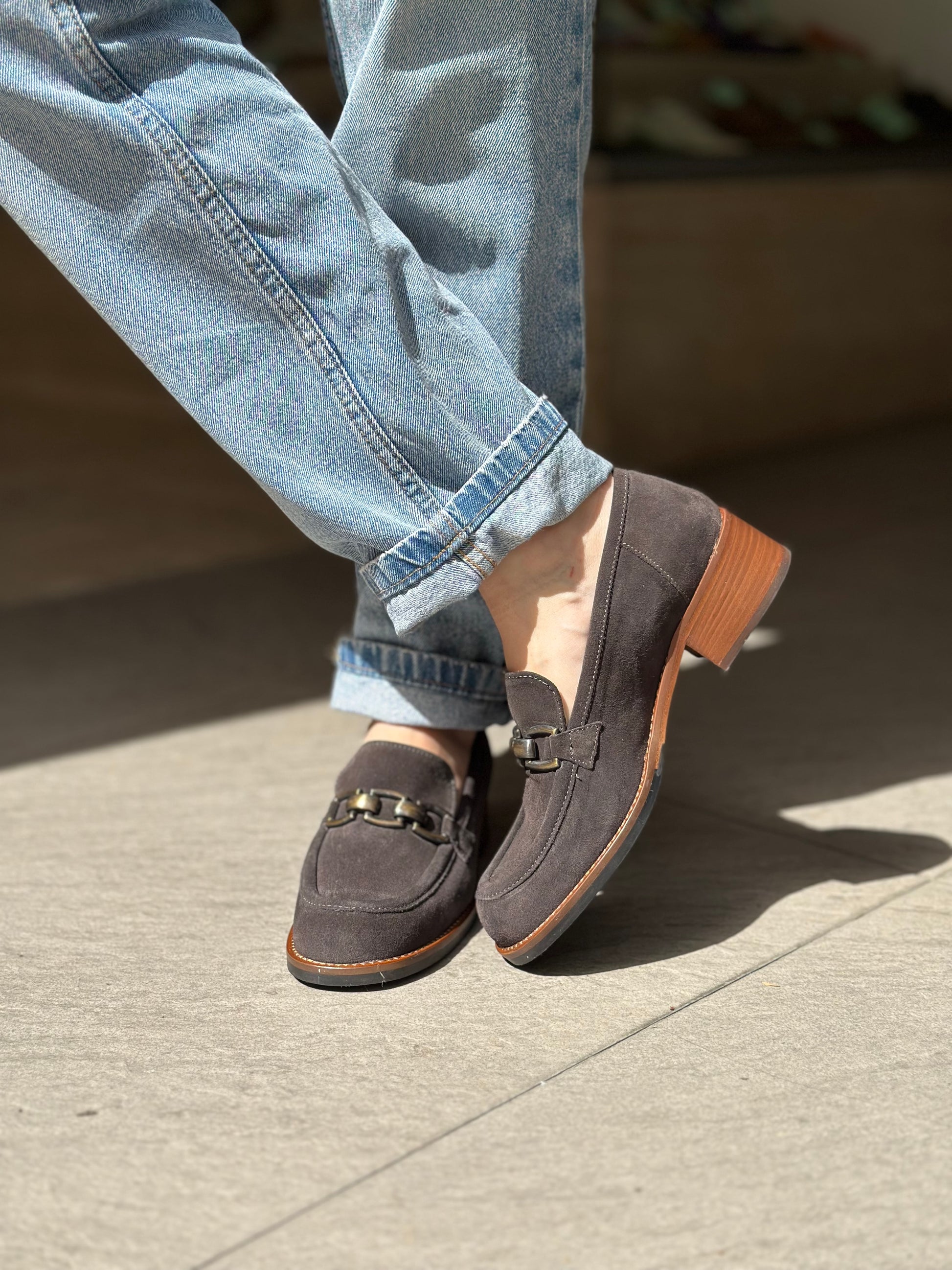 Ces mocassins pour femme MAISON21 1227 SAYO CARBONE GRIS sont faits à 100% de cuir daim gris anthracite avec un talon de 4cm et une boucle décorative sur le dessus. Leur design intemporel et le confort de leur matière en font des chaussures indispensables pour toutes les occasions.